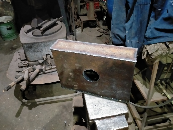 Варим коробочку с отверстием в центре, делаем в ней вход и выход, устанавливаем над горном. Получается вот такое чудовище (не волновайтесь, все это спрячется)