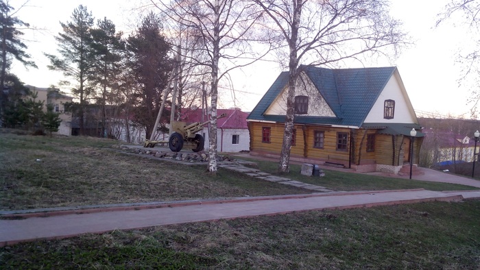 Вот вид на центр города, а я все ж таки вижу нелепость в сокращении ПГТ, поэтому город, собственно та самая Кесонная, простите Кесова Гора. Вид плавно переходит в пушку ЗИС-3 символизирующую, а хрен ее знает, не победу же, зачем ее тогда в ромелевский колер покрасили. На заднем плане краеведческий музей, туда я уже не попал, он до 6. Кстати после 7 город вымер, кроме себя я насчитал еще 2-3 обитателей. Помимо музея там еще стоит классический БЮСТ ГЕРОЯ НА РОДИНЕ