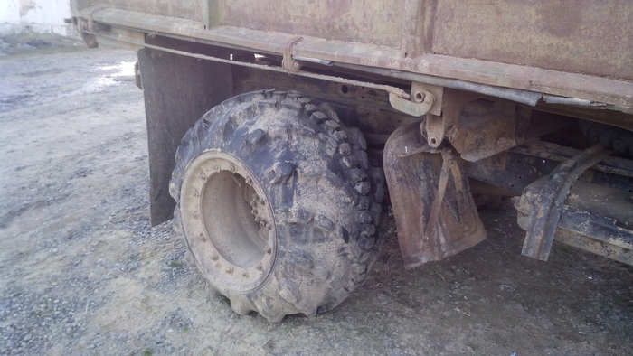 А еще совсем рядышком пожарная часть вот с таким вот замечательным ЗИЛом, в качестве задних колес у него мощнейшие болотоходы.