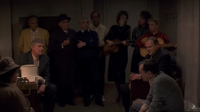 Прокурор симпатичен даже несмотря на то, что мы узнаем чудовищную историю о том, как он, будучи комсоргом, выгнал из комсомола первого исполнителя рок-н-ролла в городе и его партнершу, которая к тому же выпила какой-то химикат и на всю жизнь осталась без голоса. Потом мы видим ее уже постаревшей в гостиничном номере Варакина. Но эта сцена с пострадавшей от режима женщиной выглядит скорее комично. Я имею в виду, что, беря на эту роль актрису с ярко выраженной харáктерной внешностью, которая еще подчеркнута нелепой шляпкой, режиссер вряд ли стремился вызвать у зрителя сочувствие к судьбе героини. Да и сама сцена, где в номере Варакина как ни в чем не бывало собираются якобы непримиримые враги и едят из одной кастрюли пельмени, поют пошлые романсы и «клеят» не очень понятных женщин, на мой взгляд, скорее говорит о желании режиссера показать, что все это противостояние «либералов» и государственников — показное. На самом же деле они из одной тусовки и прекрасно друг с другом ладят.