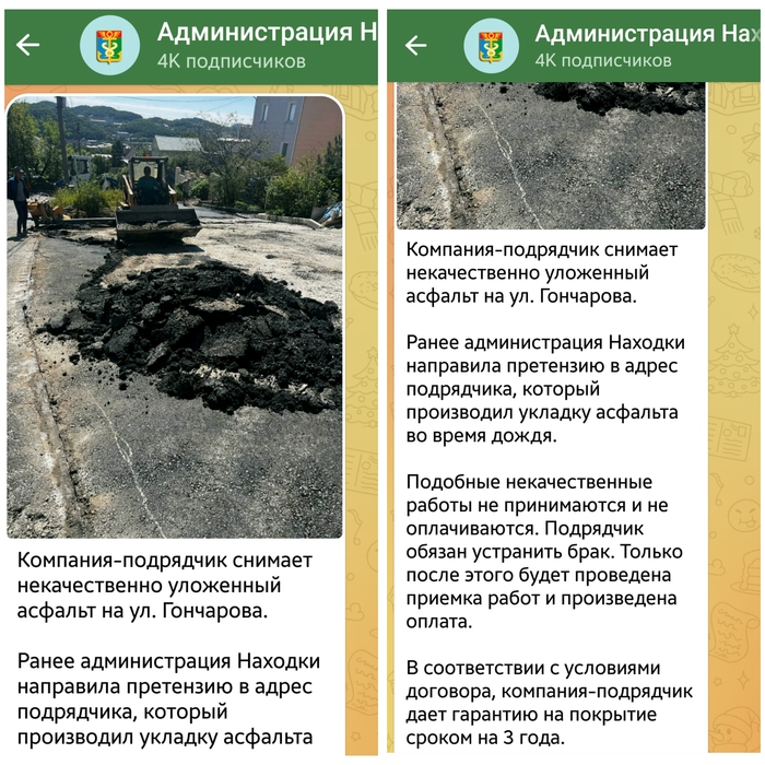 3. Разместив эти видео в сети Интернет, в частности - на Пикабу, а так же направив их в адрес Администрации Находки - через официальный телеграм-канал - я получил ответ от Администрации города, что данные работы, проведённые с прямым нарушением условий контракта - не будут приняты и оплачены Администрацией Находки.