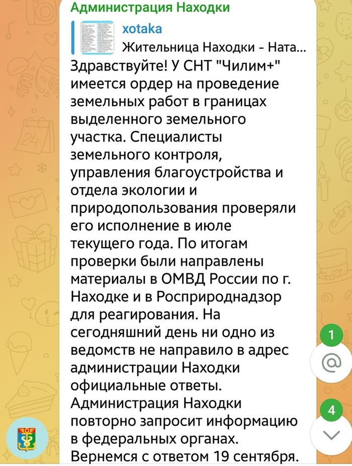 И вот буквально несколько часов назад, сегодня, 04 сентября, в официальном телеграм-канале Администрации Находки, на поднятые в этом посте вопросы - я получил такой, весьма странный, на мой взгляд, ответ: