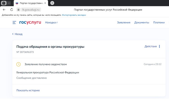 7. По итогам всего произошедшего - мы с супругой только что написали обращение в Прокуратуру Находки, через Госуслуги, с приложением ссылок на посты и видео на Пикабуд и скриншотами ответов Администрации Находки, с единственной просьбой - обеспечить безопасность моих стареньких родителей, которые были свидетелями и укладки асфальта в дождь, и моего разговора с киргизом-рабочим.