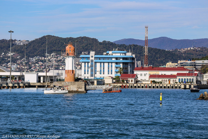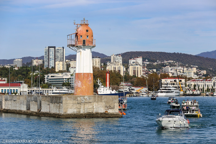 А вот там виднеется главный сочинский маяк - один из старейших на Черном море. Строительство Сочинского маяка началось после окончания Русско-турецкой войны 1877-1878 годов, когда возникла необходимость в обеспечении безопасного мореплавания вдоль Кавказской Ривьеры. Согласно историческим документам, строительные работы были завершены в 1890 году. Торжественное открытие и введение маяка в эксплуатацию состоялось 20 ноября 1890 года. Первый свет нового маяка озарил морской горизонт, обозначив для моряков безопасный путь к берегам Сочи. Оптика маяка была изготовлена во Франции компанией, основанной инженером Леопольдом Френелем, создателем знаменитых линз.