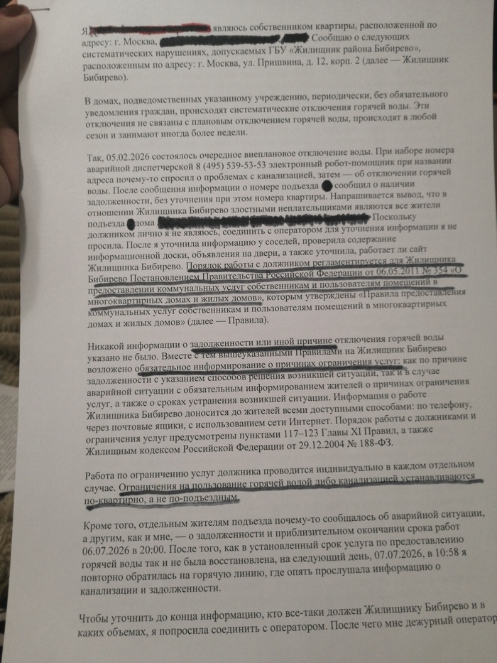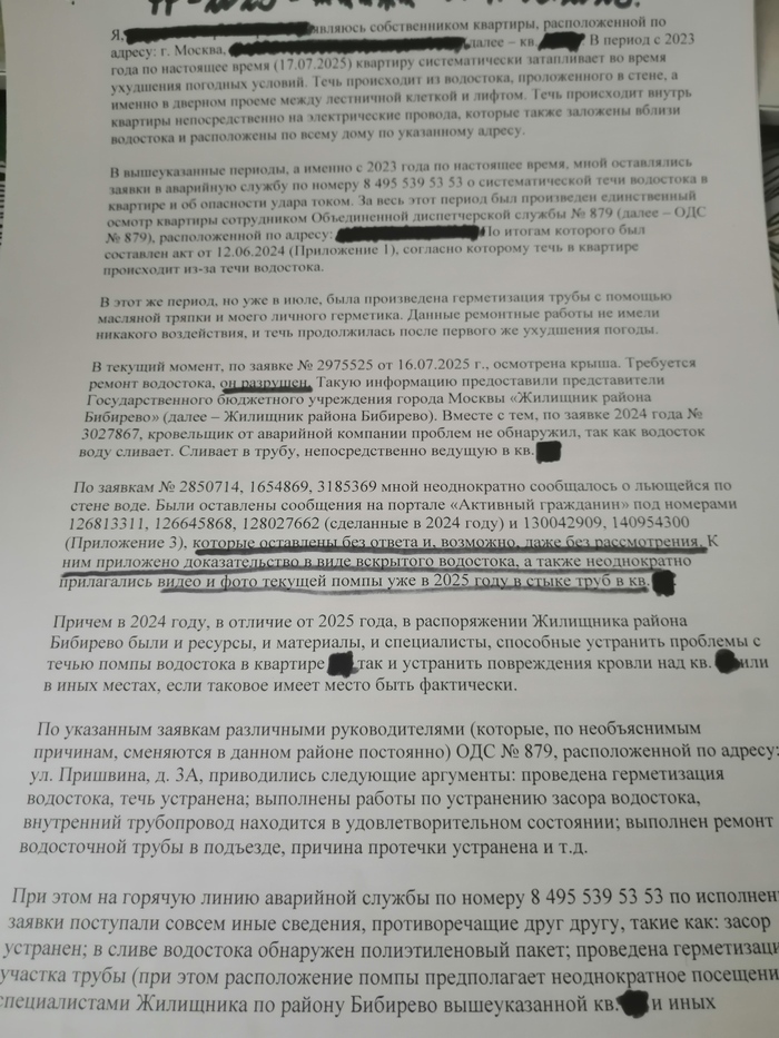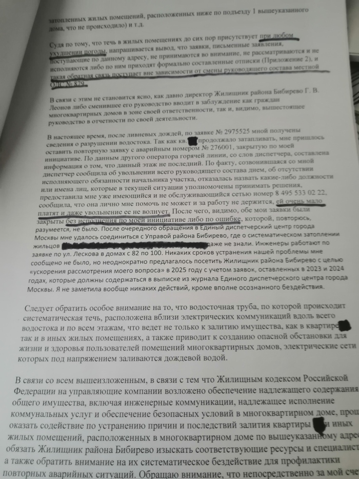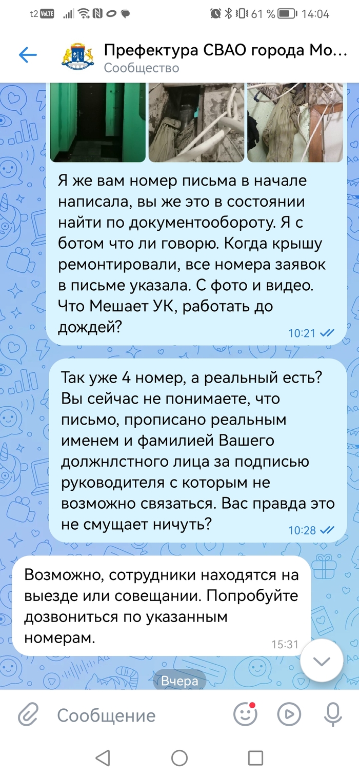 Система вроде бы сработала. Приехали осмотрели, заставили УК пошевелиться и все исправить. Трубу починили в 2025 году! , правда за наш счёт в сумму 15 000 т. р. Да вот столько стоит пайка трубы, которая УК принадлежит у них бесплатных спецов нет. Как вы поняли из письма процесс "ускорился" до сверх звуковой космической скорости. С 2023 года по настоящее время я перезнакомилась со всеми соседями, которым посчастливилось жить подомной. На свои заявки о проблемах, они видимо получали, такую же дырку от пончика что и я. Разговоры с операторам по номеру 8495 539 53 53 это, чисто по братски, отдельный вид отмороженого, отбитого напрочь театрального искусства, где жителям одного дома дают совершенно разные объяснения и решения ситуации. Ножные походы в ближайшую дежурку, результатов также не дали. Во - первых, начальники там меняются с космической скоростью, а ведут себя абсолютно одинаково наплевательски и плотют им мало (мне тоже мало, но если я бы хоть рот раскрылана тему зп, то вылетела бы со своего УК без разговоров, либо работаешь либо нет, никто ваще не держит) Кроме того, большая часть исполнителей на местах по русски не говорит и не понимает, что говорят им. Можно простоять полчаса минимум и так и не понять до чего, вы собственно договорились. Трубу в итоге поменяли, но внимание, ускоряем сознание до безумия курицы с отрубленой башкой, нооо, пробили крышу и по дождю, без цемента в тупую залили гудроном. Да мне пришлось узнать это слово. Тадам, какое-то время, именно часть зимы и весны мы прожили почти в благолепии и милости всех богов вселенной и вода на проводку не лилась, угорожая убить все живое от собачек до детей, что выйдет в коридор по всему подъезду. Но ничто хорошее не длится вечно, сработал человеческий фактор. Опять, снова, внезапно, пришла весна. И вящему изумлению всех УК, опять пошли осадки, чтоб этим тучам, черт бы их подрал и сущность их породташую за ногу, деревню их на хутор погулять. Ииииии, у меня не было луж, зато все живущие ниже меня испытывали все прелести таянья снегов . Видимо решив, что такого Щастья нам всем мало, УК внедрила ещё и систематически отключения горячей воды в любое время,сезон, без причин, без объяснений. В шутку их прозвали санкциями ЕС и НАТО. Я суше радовалась не долго, вода нашла-таки дырочку, можно сказать дырень и просочилась опять в моё личное пространство со страшной силой