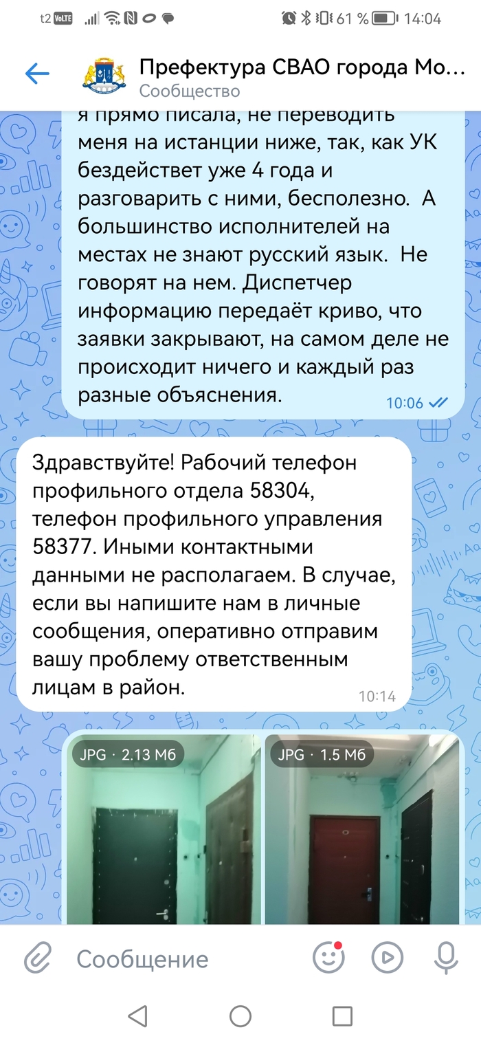 Как, уже сказано все телефоны оказались мертвее мёртвых, то - ли на совещания вообще все, то-ли все обедают. Но после того, как я написала и прислала фото. Общение почему-то не развивается, так активно, как прежде, новых не рабочих номеров пока не насыпали. Но в официальном ответе спихнули все на определённую квартиру. Видимо там живёт исчадие Ада. Представители адмистрации, как вам не стыдно, вы топите 12 этажей годами, на каждом из которых по 4 квартиры, если предположить, что в каждой по 3 человека, то доколе вы будете над ними издеваться, портить вещи, здоровье, подвергать опасности с электричеством. Вы у себя дома также хорошо правильно поступаете, чтоб всех током било?