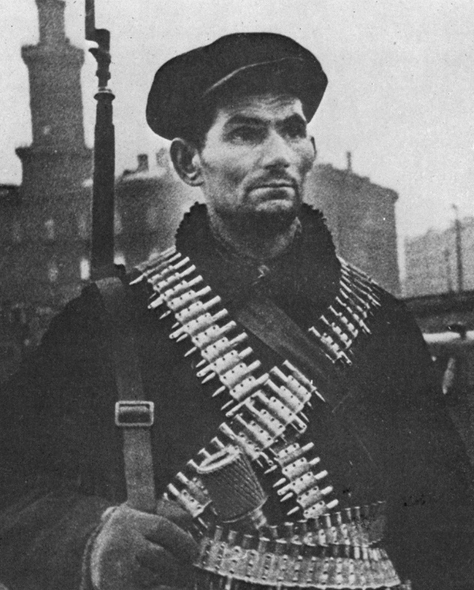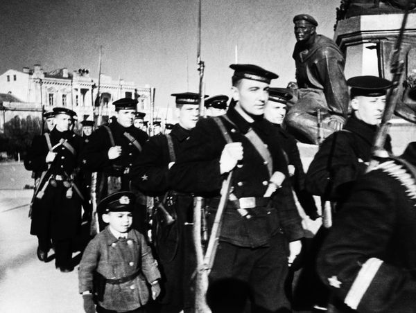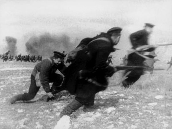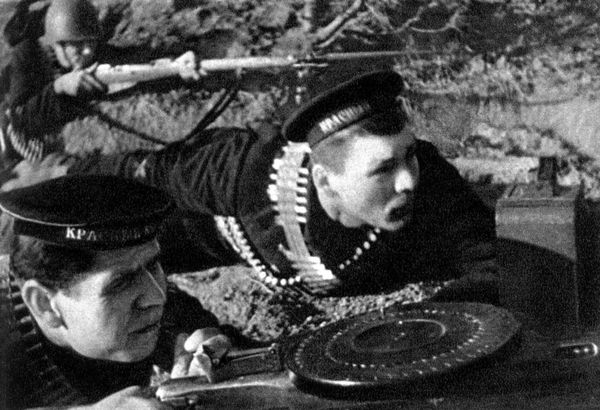 Могучая фигура рабочего, застывшего с занесенной для броска гранатой; молодой моряк, грудью своей заслонивший город; девушка, поднявшаяся на защиту родной земли вместе с отцом и братом.