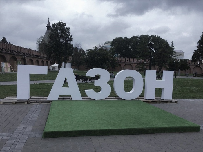 Шаг за шагом я выходил из Тулы постсоветской и приближался к Туле «бездуховной», но более свежей, можно сказать - готовой к экспериментам. И несмотря на то что у врат кремля меня встретил "классический" Ленин, аккуратные тротуары, представительный вид местной архитектуры и тому подобные классические постройки. За своей стеной, крепость неожиданно удивляет набором нестандартных решений… Войдя внутрь сразу бросилась, вполне, логичная картонная скульптура «ГАЗОН»: за которой, как ни странно, располагался хорошо подстриженный газон.