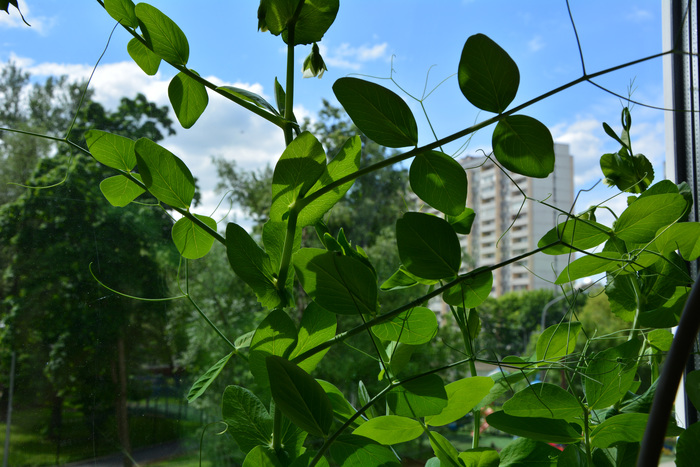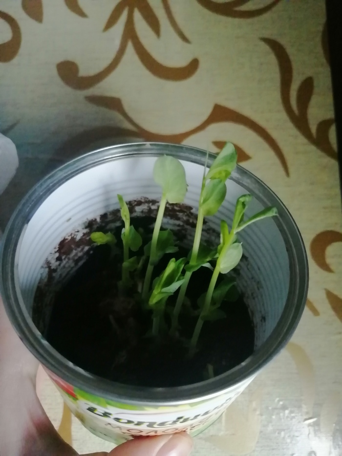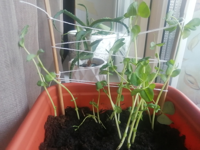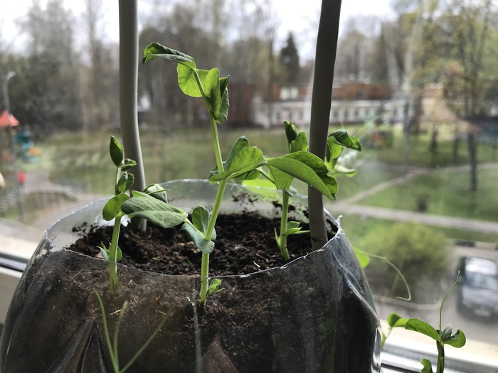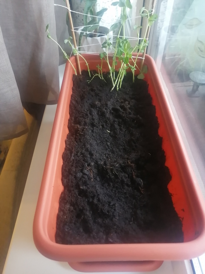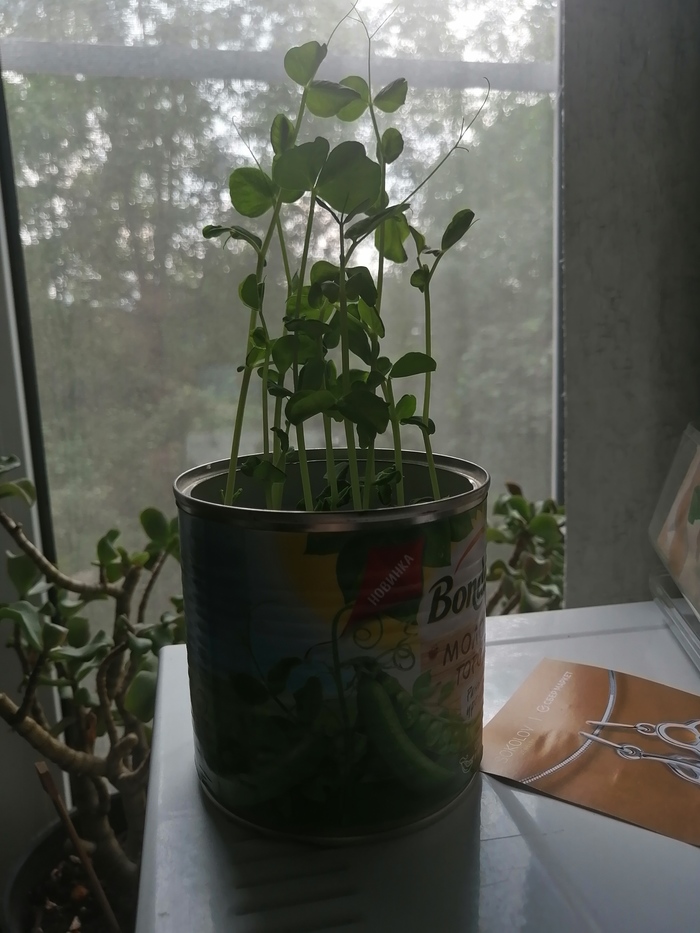 С доставкой приехал ещё рекламный пакет гороха. Итого : был пересажен выросший горошек и посажен сразу в горшок 1,5 пакета бобов (семян,... Хз).