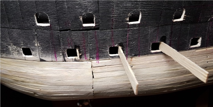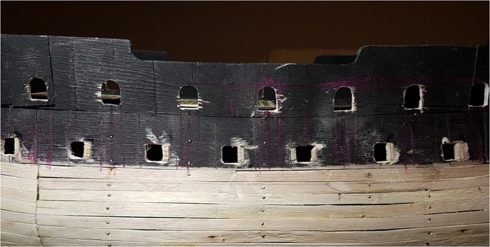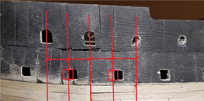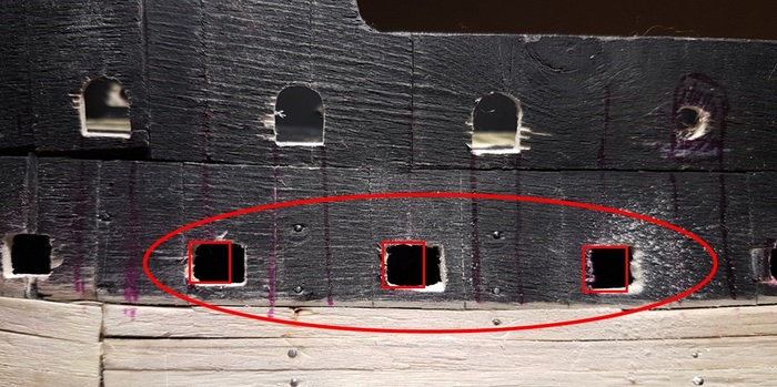 Не рассказал вам про один косячёк, который чуть не похоронил всю задумку. Я криво высверлил пушечные порты нижней палубы. Красным показано, где они должны были быть.