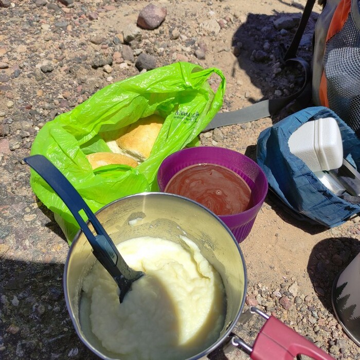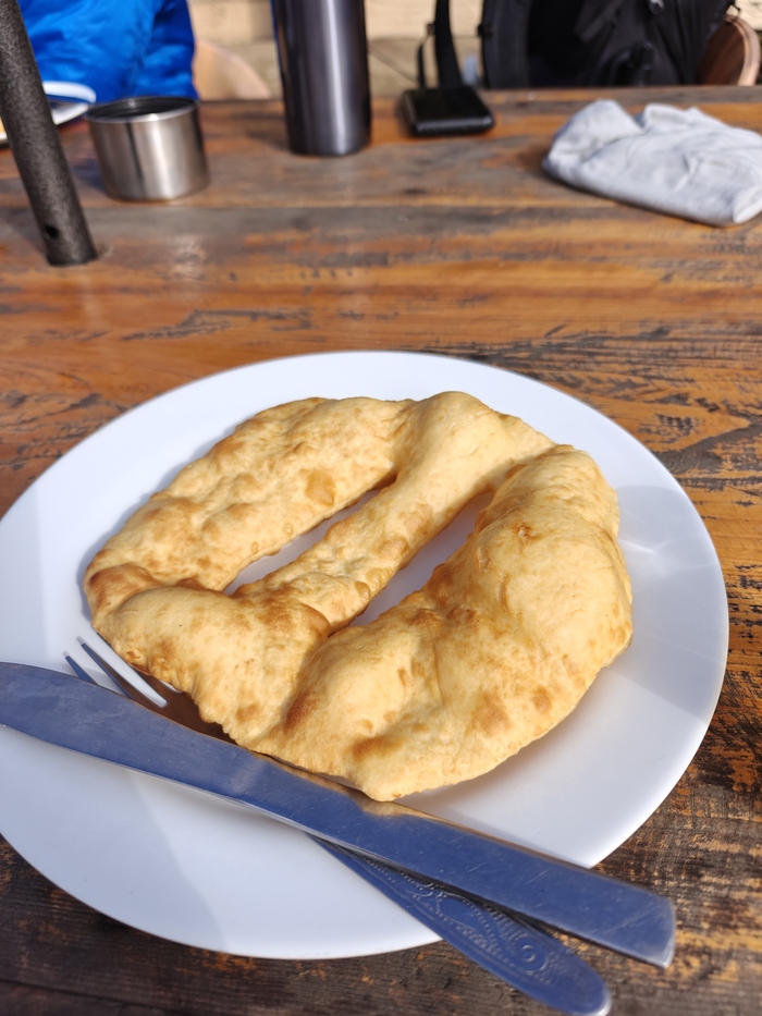 После нескольких часов пути мы остановились на обед. Отошли в сторону от дороги и расположились с шикарным видом на Северо-Чуйский хребет. Съели салат с тунцом, который я приготовила специально для похода, и двинулись дальше.
