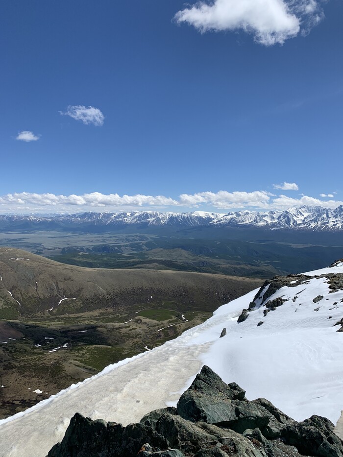 Во-первых, высота этой горы — 3038 метров. С вершины на 360° открывается потрясающая панорама заснеженных пиков Северо-Чуйского хребта. В ясную погоду можно даже увидеть знаменитую Белуху. Внизу, у подножия снежного хребта, виднеется изумрудная долина с извивающейся лентой реки Чуи. В общем, виды — огонь, это вообще не всяких сомнений.