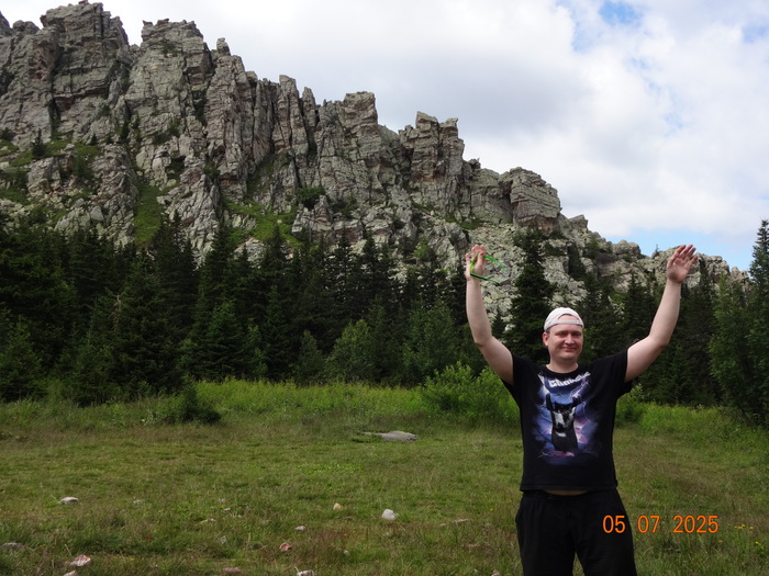 Дальше начались спуски и подъемы, грязи стало значительно меньше, была долина сказок, там стояли каменные туры, выглядит это атмосферно. Вместе с Софьей и Викой решили здороваться (в походах в горы все друг с другом здороваются) на иностраном языке (я на немецком guten tag). Но, на мне была футболка с котом с надписью "я спокоен", поэтому на иностранца я был не похож. Вот было бы пенсне, трубка и шляпа, может и приняли бы за иностранца, плюс акцент.