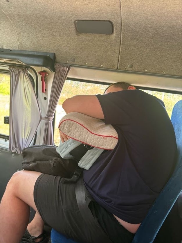 Выезд был довольно поздним, в час я поехал к Марине помочь загрузиться, первое такси от нас отказалось, сказали, что грузовое нужно вызывать... Я поворчал и вызвали 2-е такси, влезли и к 2:05 приехали. Дольше всех ждали Максима (понимаю, что имена ничего не дают, но я все равно оставлю их тут), он не мог вызвать такси из-за перебоев со связью в Перми в этот день. В 2:40 мы выехали на белой газеле с прицепом от Карнавала. Стартовали довольно быстро, проехали 200 км незаметно. Немного почитал книгу Стивена Кинга "Клатбище домашних жывотных". Общались со всеми обо всём, Марина угостила меня бутербродом, за это отдельное спасибо! Сам я купил 2 банана и пикник. По пути 2 раза заправлялись газом, один раз выходили погулять и один раз останавливались в кафе. Кафе было средним, поел последний гороховый суп, домашнее жаркое (не сильно и домашнее), оливье и компот (он был безвкусным). По дороге видели аварию с смертельным исходом, это грустно, сразу пристегнул ремень на всякий случай. В этот раз взял с собой подушку, поэтому ехать было мягко и комфортно, сидел как обычно у окна, поэтому всегда мог открыть его и проветрить.