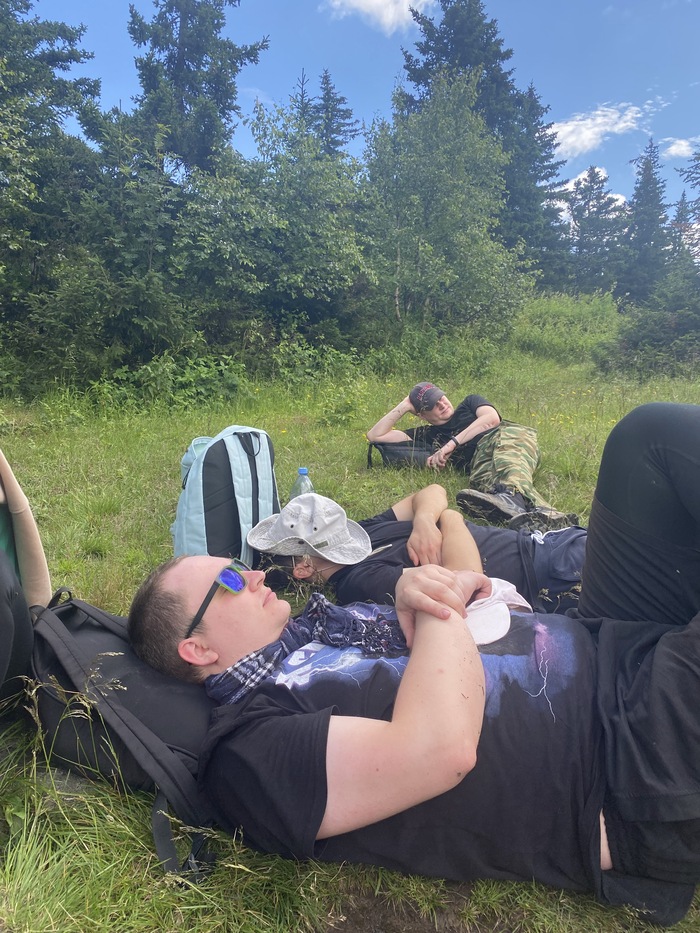 Подъем был в 6:45 утра, разбудила меня Марина или Юля разжигать костер, полниматься было тяжело, не выспался. При этом быстро все разжег, и пошел заниматься йогой, это было прекрасной идеей, спасибо за нее Софье. Позавтракали почти все (кроме Полины) рисовой кашей на молоке с вишнёвым вареньем, было вкусно! Попили чай с конфетами, наготовили бутербродов с собой в поход (порезали колбасу и сыр).