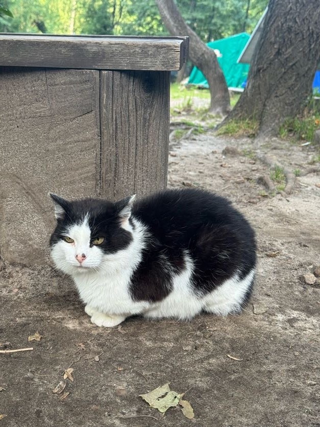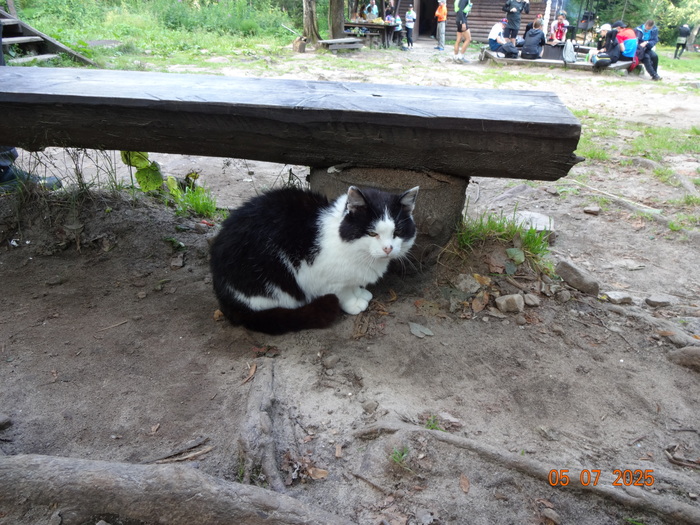 И тут из-за угла домика вышел... кот. С невозмутимым взглядом опытного путешественника. Он лениво потянулся, подошёл к нам и уселся рядом, будто проверял, чем тут можно поживиться.
