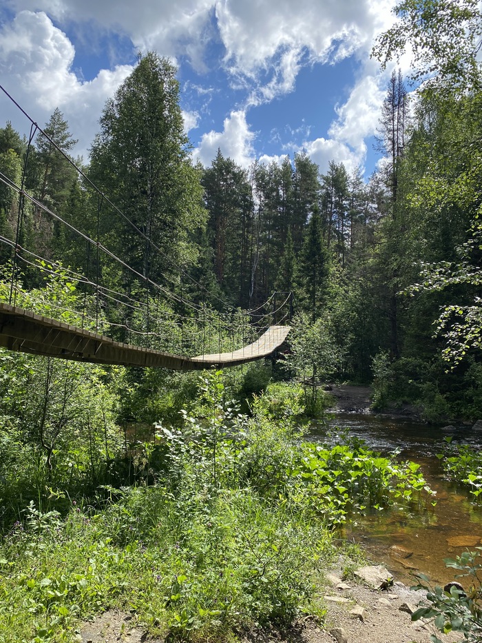 Двигаясь дальше, мы свернули на верхнюю тропу, ведущую к приюту «Белый ключ». Этот путь был круче, но живописнее — с него открывались первые виды на Двуглавую сопку. Наш путь пролегал через знаменитый Горбатый мост, перейдя его через пару часов мы достигли приюта. Здесь, среди сосен, стояли деревянные домики, а рядом журчал холодный ручей. Мы бросили рюкзаки и сразу же умылись ледяной водой — блаженство!