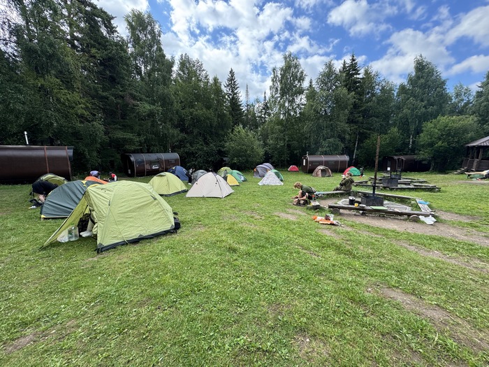 Приехали на стоянку в 23:30. С нас за вход взяли меньше, чем должны, поэтому потом на оставшиеся средства купили дрова по 150р за охапку. Разжег костер, правда горел он довольно плохо, костровище было низким, поэтому еда готовилась довольно долго. Были рошки с тушёнкой и чай. Поели вкусно, спасибо Марине! Сидели у костра, знакомились, общались, возможно пели песни, только я в этом не уверен. Людей на поляне было много, поэтому поставили на 2 палатки меньше, чем планировали изначально. Лёг спать в 3 часа ночи, уснул в 4.