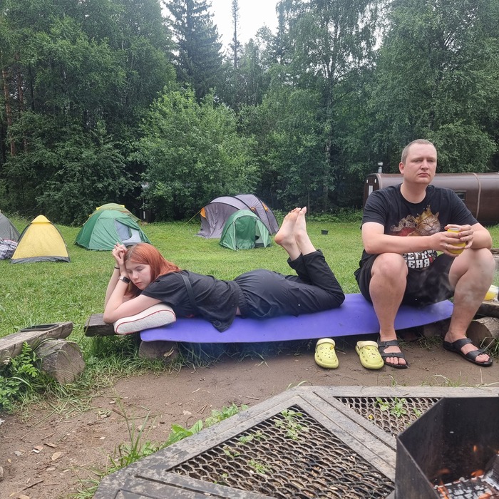 На завтрак был гречкоборщ (греча, тушенка и 2 заправки для борща), он был вкусным и в меру солёным. Был чай. Был дождь, но не критичный, было лежание на скамейке.