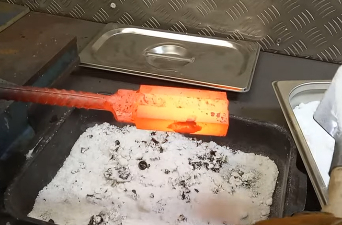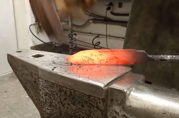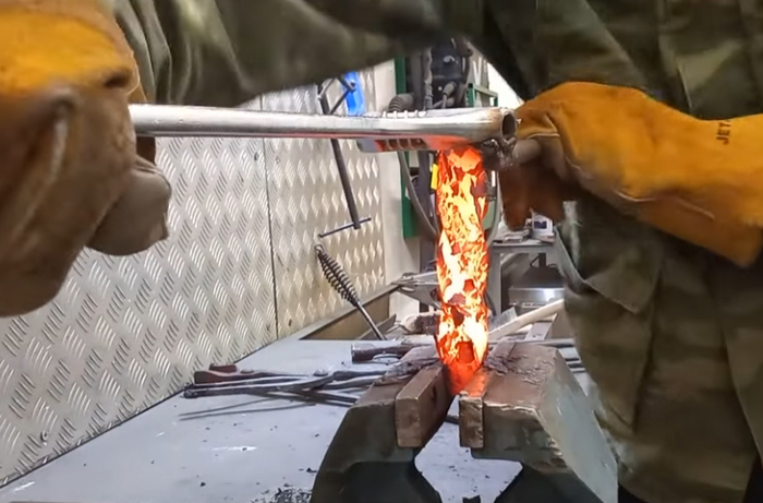 Вот здесь как раз видно, почему нужна практика: при работе с двумя деталями подряд заметно, что под конец уже вяло стучу - устал. Куртка МЧС, кстати, не моя, а отца. И напомню: окалина с горячих заготовок может прилететь в глаз, поэтому носите защитные очки!