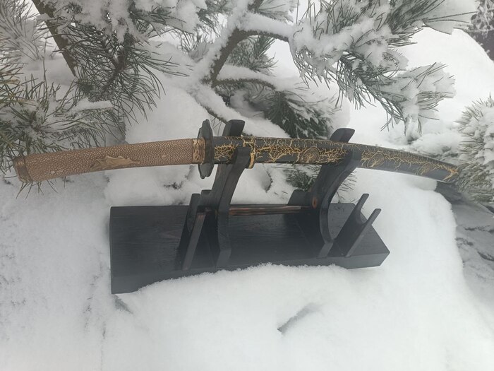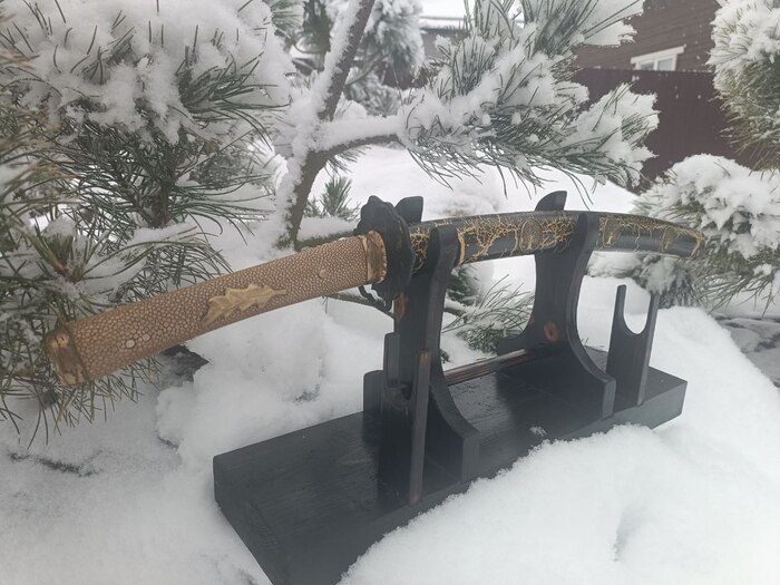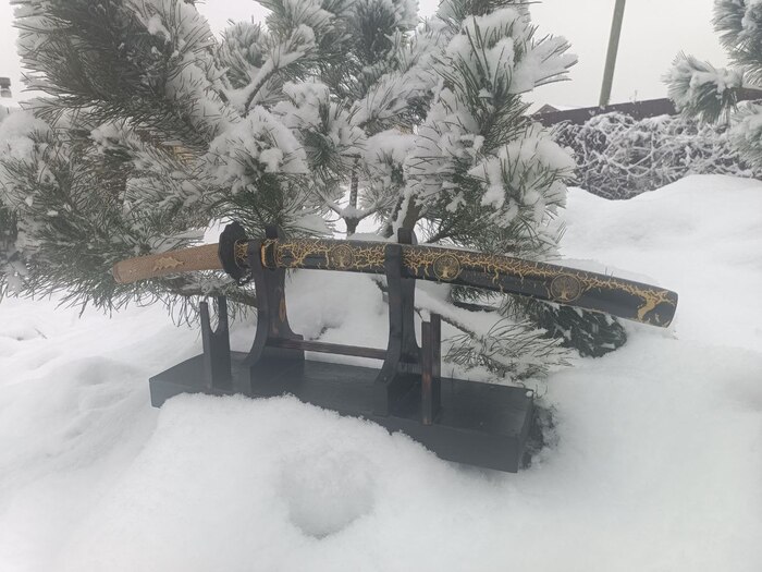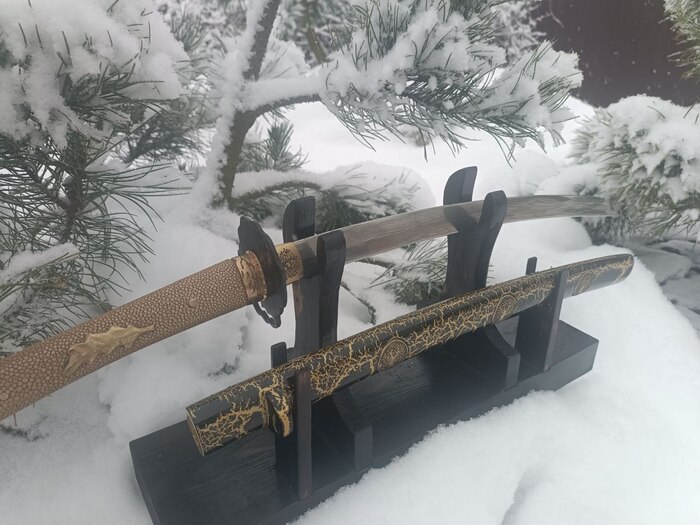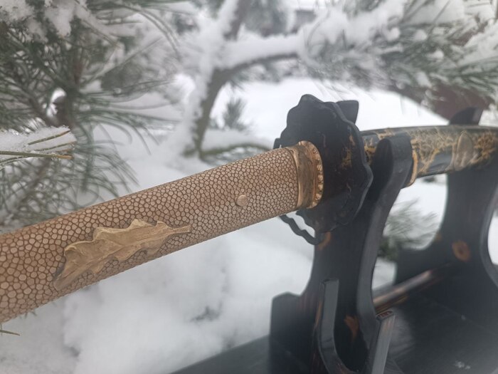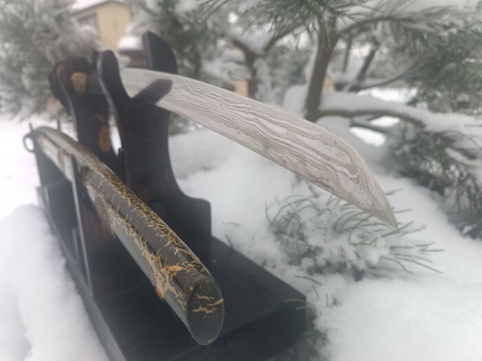 • клинок — оригинальный ламинат прямослойный 33 слоя (Серьёзно? Товарищи дорогие, ламинат в данном случае это не то, что на пол кладут, это многослойный пакет стали). Извините за дисклеймер.