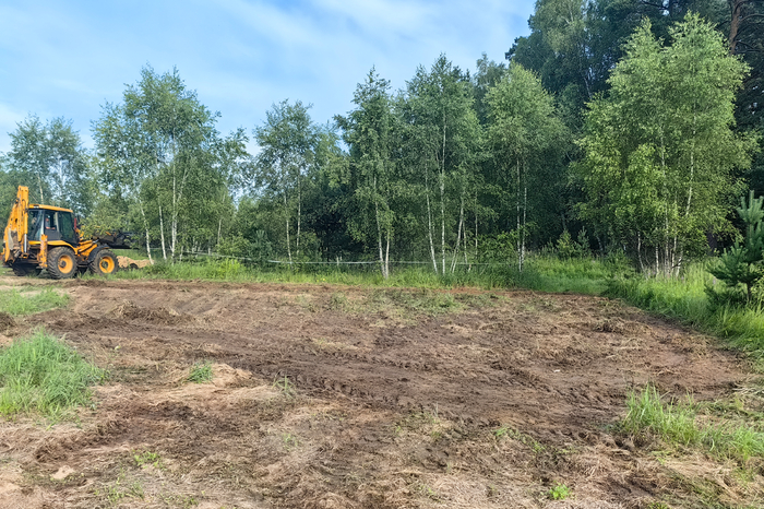 Начать пришлось с того, чтобы снять «газон». Вернее, если б это был газон — полбеды. Это был мощный, многовековой, укоренённый лесной дёрн. Вы пытались когда-нибудь лопатой нарезать асфальт? :) Вот по ощущениям то же самое. Поэтому содрали всё безжалостно бульдозером.