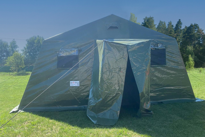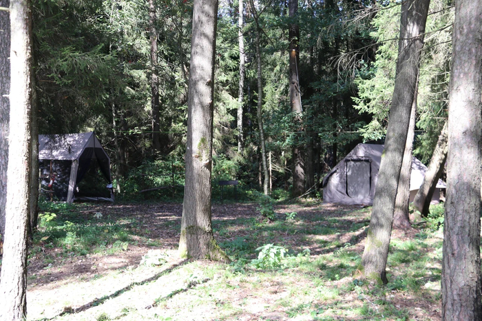 Первым делом — крыша, защита и от пекла, и от осадков. Начали с двух тканевых шатров, которые никогда не лишние.
