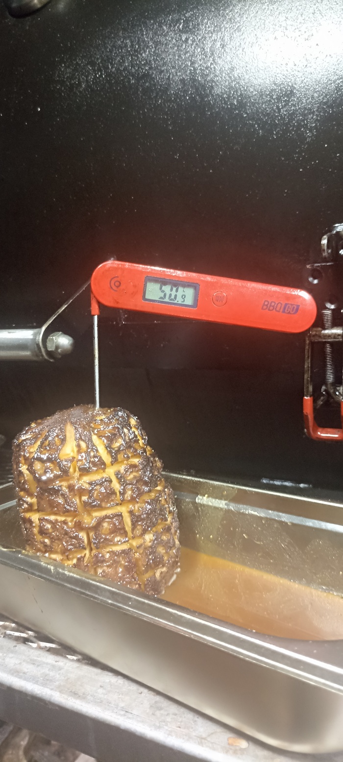 🔹Свиную шею помещаю в термокамеру коптильни. В самый толстый кусок продукта втыкаю термощуп и первым делом провожу обсушку при температуре +60°C, до образования сухой поверхности на мясе и появления корочки янтарного цвета. Заняло у меня это, два с половиной часа.