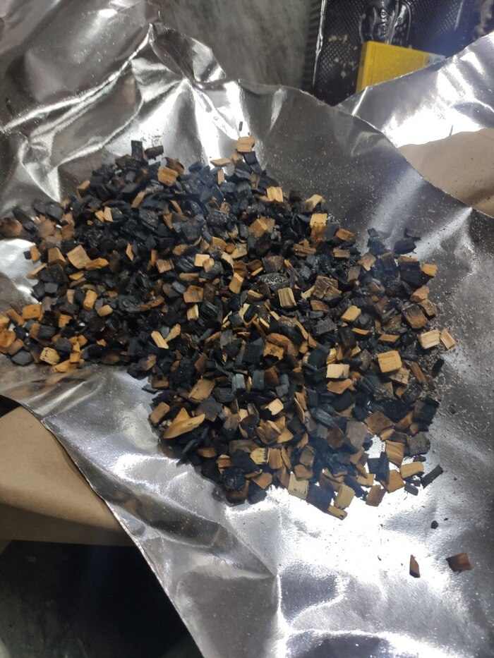 А вот так выглядит отработанная щепа если копчение проходило при правильных температурах. Это кстати вся щепа что ушла за 8 часов, но даже она не вся выгорела. Примерно 30% еще осталось, но перебирать я ее конечно же не буду, кстати щепы было примерно 300-400г