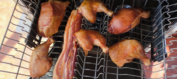Всем привет. Это не про рецепты, граммы и температуры. Это про то, что не надо бояться) Варением мясных изделий по этапам обсужка, обжарка, варка лет 10 наверное периодически занимаюсь на домашнем конечно уровне, в духовке. Сыровял говорят тоже удаётся. А вот коптить не где было. Но недавно приобрели небольшую дачу, поставил беседку на участке и желание что-то закоптить вновь вернулось. Посмотрел интернеты всякие на предмет готовых решений, есть хорошие варианты, но чёт жаба давила, да и есть куда потратить деньги. А тратить деньги и вдруг тема не зайдёт опасался. Хорошо, что есть такой же отбитый на теме домашнего мясоперерабатывания друг. Коптилка говорит есть, нужно замутить шкаф и источник температуры. Чтошш, на сайте объявлений нашли неисправную посудомойку за 500 рублей, в леруе купили строительный фен в районе тыщи, ну а термощуп уже был. Автомойкой отмыли шкаф до состояния как из магазина, ну вдруг там какая химия на стенках. В результате была сооружена вот такая вундервафля