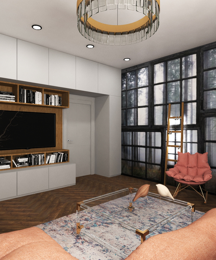 К созданию этой работы меня вдохновила яркая мебель студии LoftDesign - их чудесный розовый мягкий диван и уютное кресло-качалка. На стенах дизайнерские обои от InMyroom. Обои придают комнате необычность, когда в комнате мало окон их можно добавить на стену и вся стена превратится в портал, за которым загадочный лес.
