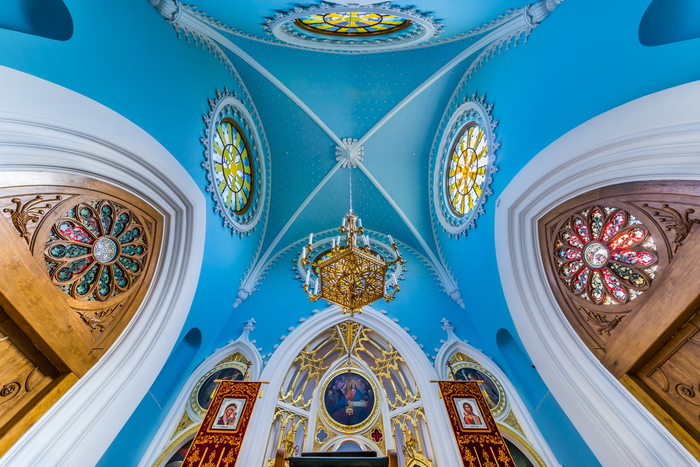 Цветные окна выписывали из Мюнхена, но сюжеты — православные святые. Немецкие мастера так и не поняли, зачем католические технологии русским иконам.