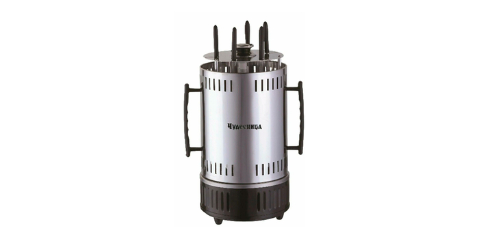 Шампуров здесь также 5, но в комплекте предусмотрен еще 1 запасной. Они имеют витую форму, чтобы кусочки мяса не сползали, а также выделяются чуть большей длиной – 33 см. В комплекте есть и съемные чашечки для сбора жира, которые устанавливаются под шампуры. Скорость вращения у модели невысокая – 2 оборота в минуту. Считается, это необходимо для наиболее равномерного обжаривания.