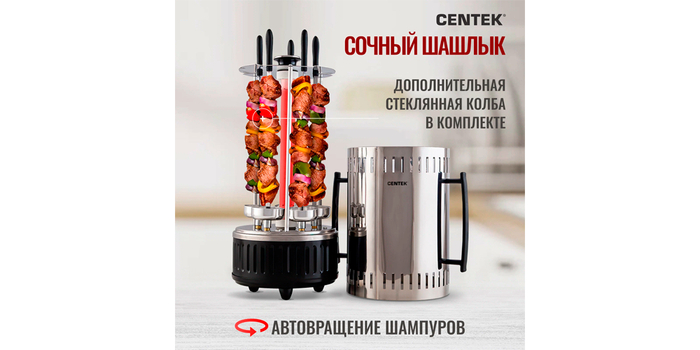Открывает рейтинг относительно недорогая модель Centek CT-1460 в традиционном для категории вертикальном исполнении. ТЭН, расположенный в центре, наделен защитной стеклянной колбой, поэтому на него не налипает жир, куски мяса и существенно облегчается очистка. Мощность составляет 1200 Вт — это отличный показатель для недорогих моделей.