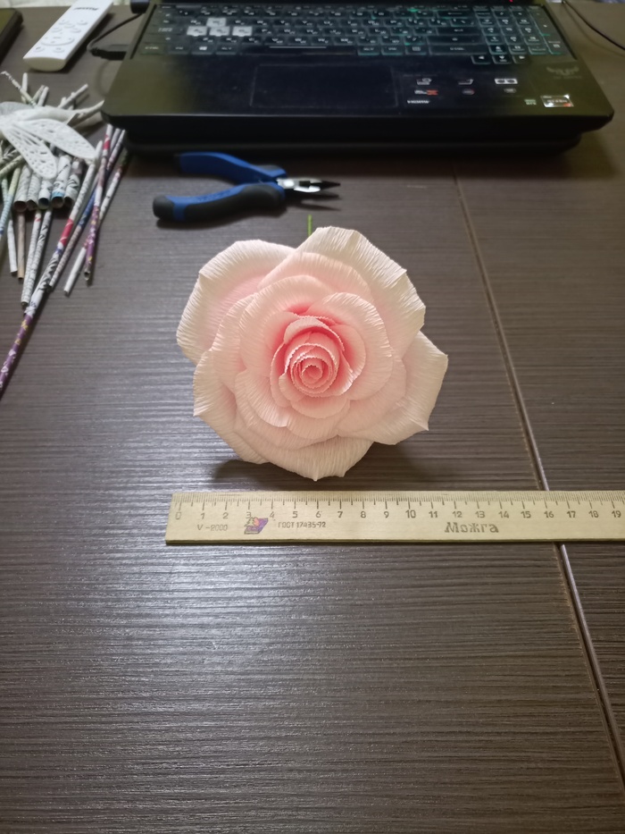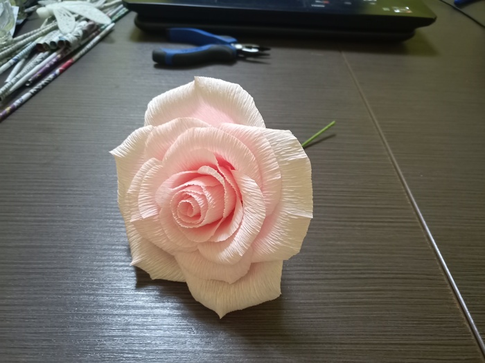 Два часа времени, гофрированная бумага, термоклей, проволока. Как результат-заряд позитива от процесса нарезания и формирования цветков.