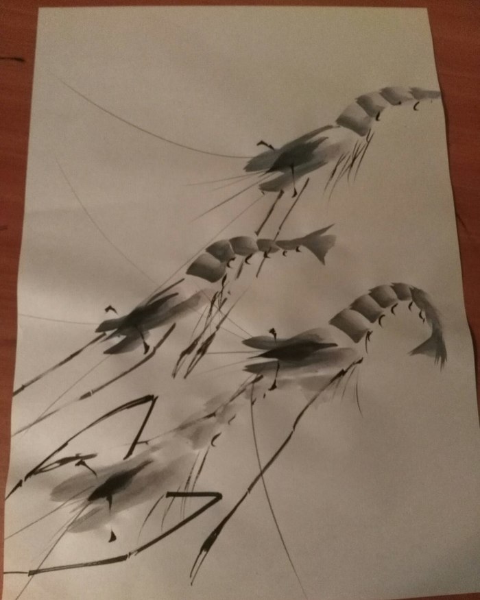 Но на последнем экзамене зимней сессии я вдруг понял как я хочу рисовать. Купил тушь кисти и начал с креветок. Креветки мастера Ци Байши вы легко найдете, и я покажу своих.
