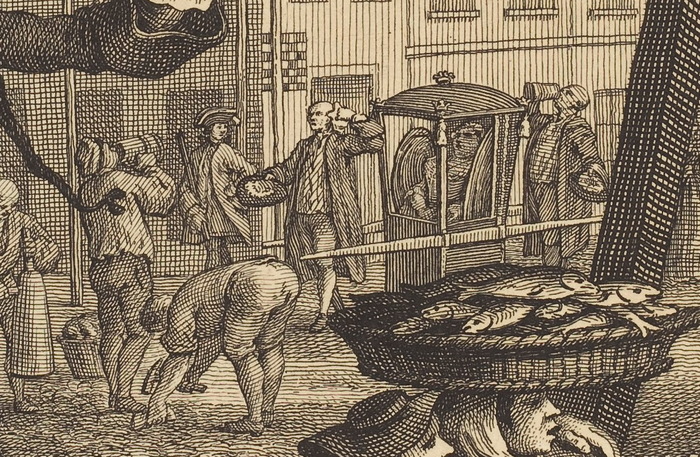 На заднем плане тоже все при деле. Два мужичка поставили паланкин с богатой дамой, чтобы промочить горло кружечой пивка, а она бедная терпеливо ждет.