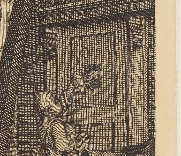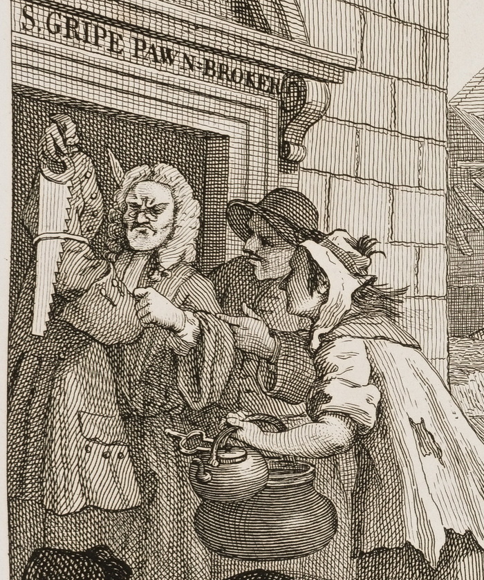 Еще выше единственный персонаж, который чувствует себя на картине прекрасно – ростовщик мистер Грайп. (Gripe по-английски недовольство) Дядька в шляпе, по всей видимости – плотник, он притащил ему в заклад свою ножовку, а женщина принесла домашнюю посуду, чтобы обменять ее на пару пенни.