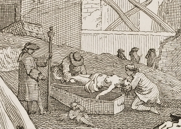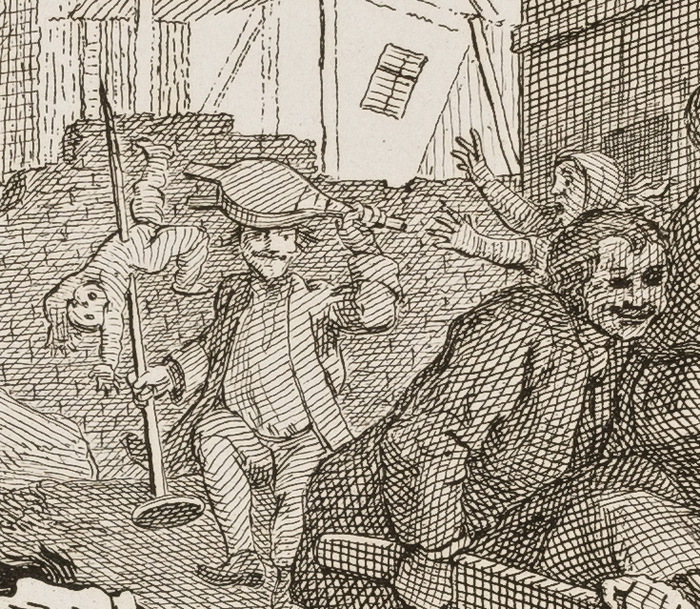 Вдали посередине улицы стоит гроб, в который укладывают женщину, рядом с гробом плачет ее ребенок. Рядом стоит бидл, который с посохом (на самом деле это булава), а бидл это что-то вроде констебля.