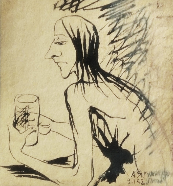 Пониже на лестнице сидит истощенный мертвец, судя по мундиру – бывший солдат, он заложил свою сорочку, чтобы купить джина, который так и остался в его корзине.