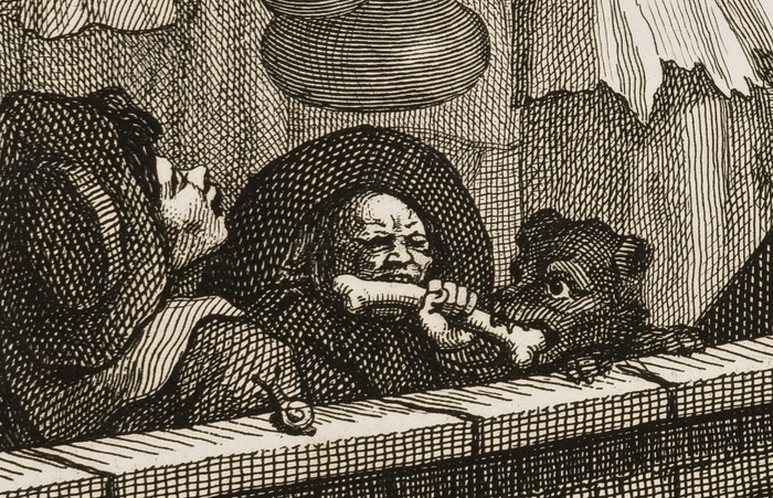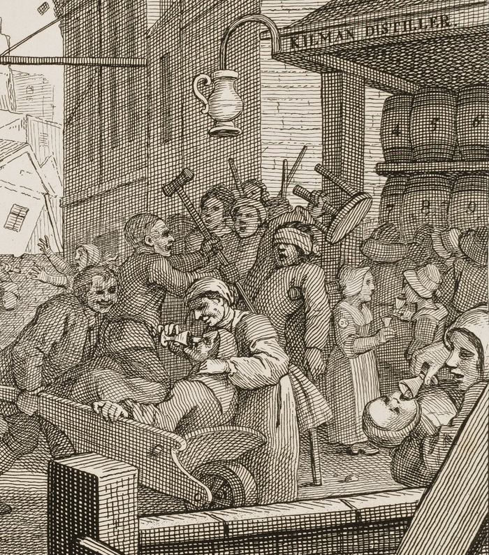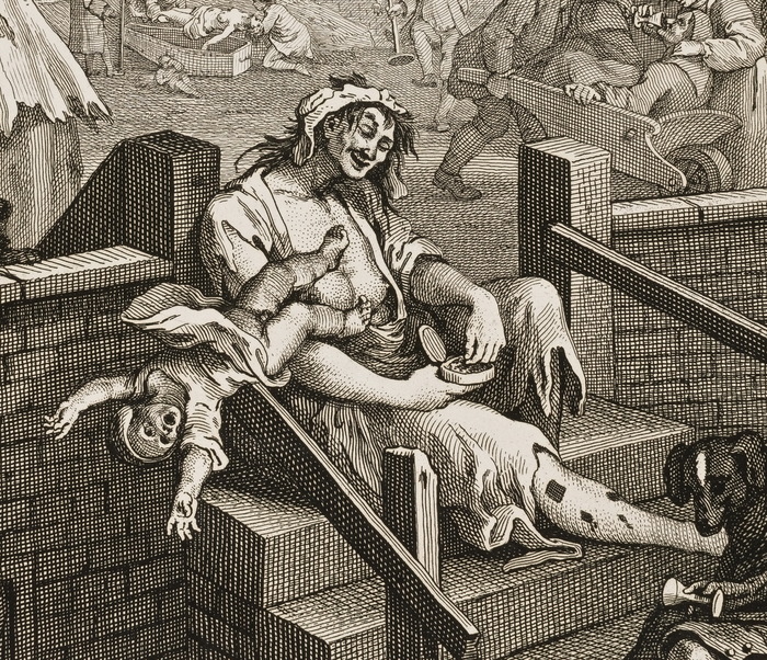 На переднем плане сидит дамочка, нюхающая табак, которая упоролась джином, до такой степени, что уронила младенца в подвал, где тоже, кстати, хранится джин. Она еще и проститутка – видите язвы от сифилиса на ногах. Реальный случай - в 1734 году некая Джудит Дюфур забрала свою двухлетнюю дочь Мэри из работного дома, где ей выдали новый комплект одежды; затем она задушила девочку и оставила её тело в канаве, чтобы продать одежду (за 1 шиллинг 4 пенса) и купить джина.