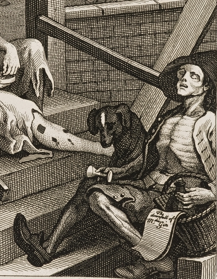 Ну и основная тусовка у дверей гнезда разврата – винокурни. Фамилия винокура говорящая – Killman). Справа на переднем плане нерадивая мамаша заливает ребенку рюмку джина. Позади них две малолетки взяли по рюмочке джина) Круглый значок «SG» на рукаве одной из них означает, что они из прихода Сент-Джайлс. По какой-то причине Хогарт недолюбливал этот приход – у него есть серия гравюр жестокость, там действие тоже происходит в Сент-Джайлс.