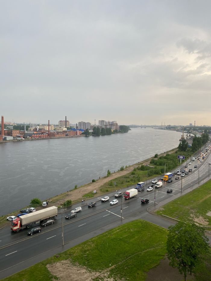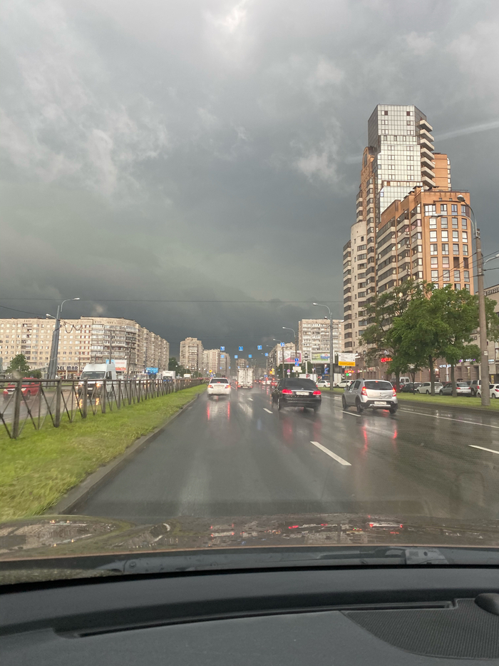 Резко изменились погодные условия в Санкт- Петербурге, буквально за 2 часа, оказались в самом эпицентре. Метро Звёздная. На фото мы только подъезжаем к эпицентру. До шторма было +33, солнце.