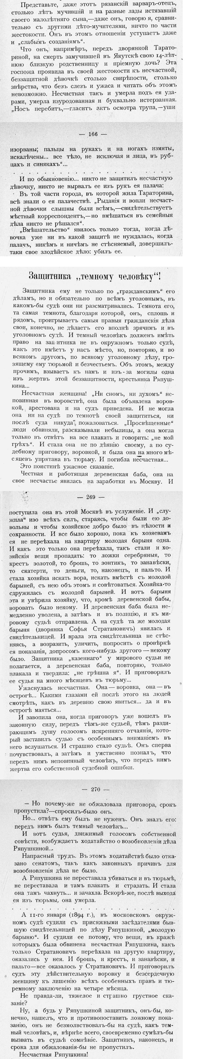 На базаре у харчевен стояли три воза с ящиками, в которых была сушеная рыба. На переднем возу караулил мальчик Ив. Зыренов, к которому подошли трое... Один из последних отвлек внимание мальчика разговором, а другие в это время вынули из ящика рыбу и бросились бежать. Городовой задержал Дойновского, сознавшегося в краже. На суде в последней краже Дойновский не отрицает своей вины. Присяжные дали Дойновскому снисхождение; суд приговорил его за кражу курицы и рыбы на 6 мес. тюрьмы."