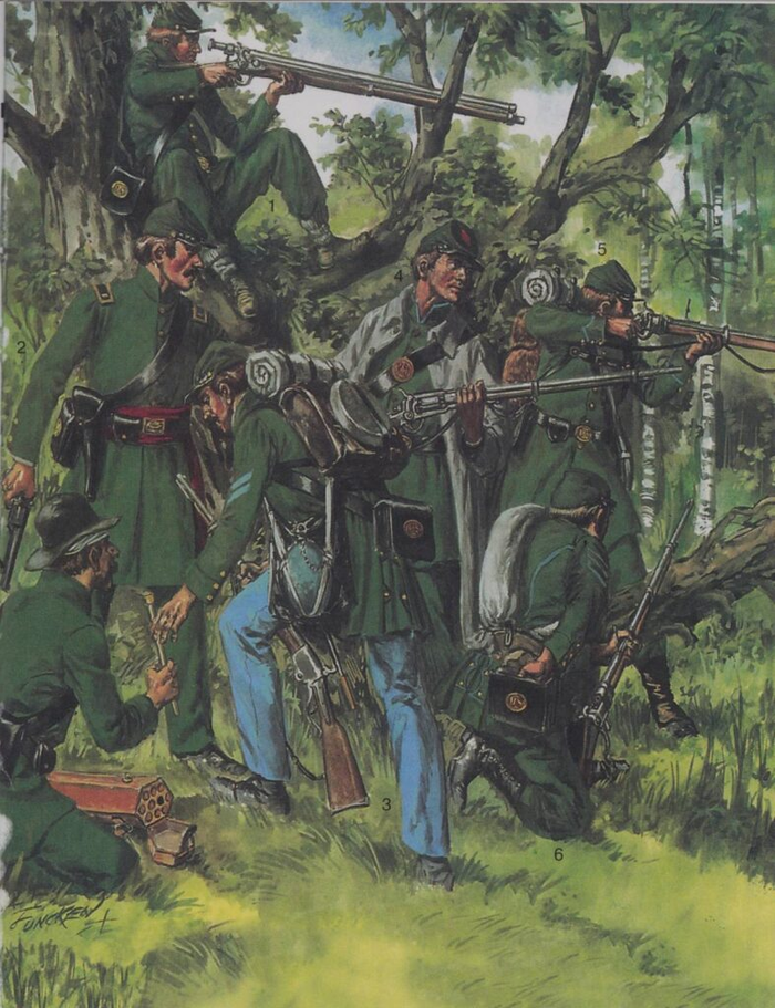 Часть снайперов была вооружена многозарядной винтовкой Спенсера, магазин которой был расположен в прикладе. Магазинная винтовка Спенсера была разработана в 1860 году и в начале войны фабрика выполнила заказ на поставку 10 000 винтовок.