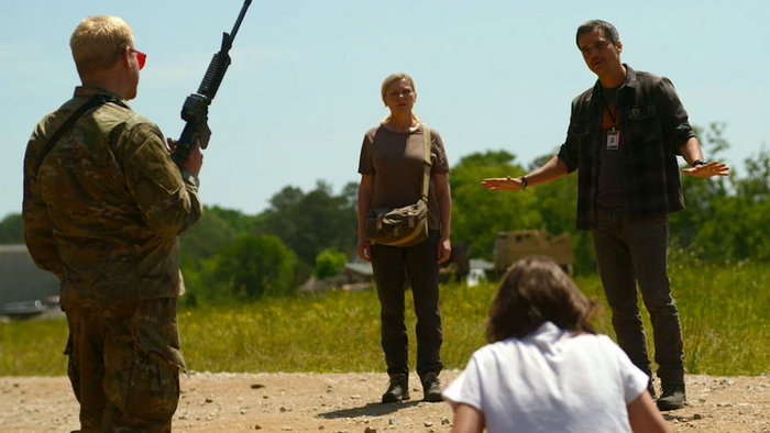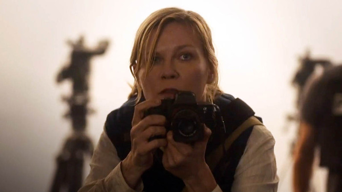 И тут же арка взросления. Потому что главная героиня тут вовсе не женщина в исполнении Кирстен Данст, а девушка, которую тут играет Кейли Спейни. Опытная фотокорреспондент, которая уже повидала, и девчонка, не маленькая, но всё ещё по сути ребёнок. Она рвётся в бой, жаждет снимать на плёночную фотокамеру гражданскую войну в США, но, естественно, столкновение с настоящей войной, с пулями, которые свистят у виска, с трупами и стволами в лицо выворачивает её наизнанку!