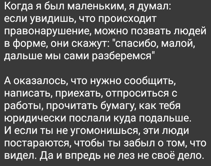Пфф.. Я как то решил, что тоже буду взрослым, ответственным и вся хурма. Сфоткал машину, которая одновременно стояла на газоне и тротуаре. Казалось бы - делов то, отправил фото куда надо с приложением краткого описания сего недоразумения. Ну мало того, что как то мой номер оказался у мужа водятельницы (а именно она так лихо запарковалась), так еще вызвали в местное ГИБДД с формулировкой - мы во вашим присланным материалам нихера не можем, у нас лапки, поэтому вы ножками в будний день в дневные часы к нам придите и заявление оформим, опросим вас и всё такое. А иначе, ничего никому не будет. И вот попадаются посты из Белорусии, где просто сфоткал, чуть ли не в ватсап отправил, а владельцу уже штраф летит, и вспоминаю этот случай. И как то непонятно становится. Вот у нас есть ГосУслуги. Такого уровня сервиса, на сколько я знаю, нет ни в одной стране. Только у нас можно получить загран, оформить кучу вообще всего, не поднимая жеппу с дивана, прям с телефона. А с другой стороны - вот такие истории. Как так, я хз.