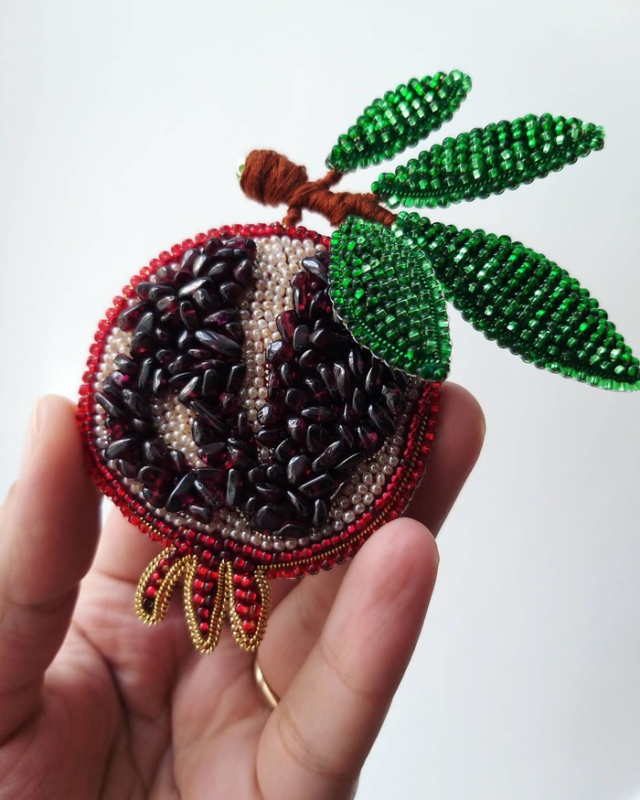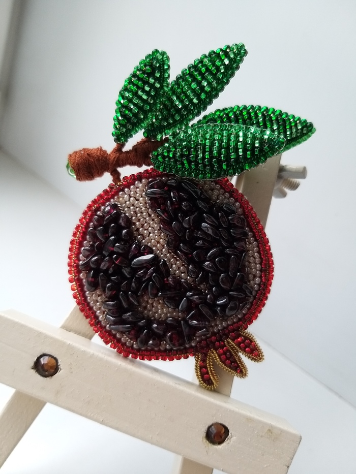 Изготовлена из чешского бисера, жёсткой канители, натурального граната, хлопковых ниток.