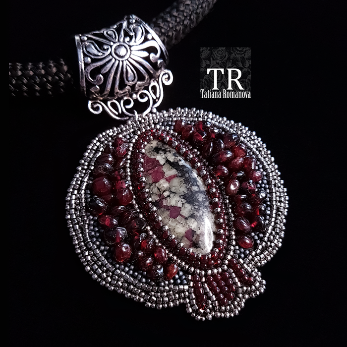 Кулон выполнен в технике вышивка. Материалы, которые тут использованы подбирались тщательно. Сколы натурального камня гранат, кабошон эвдиалита по центру кулона, бисер с палладиевым покрытием, текстильный шнур.
