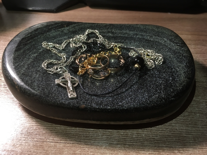 Камень с огорода заказчика, делал бесплатно, так как был не уверен в своих силах. Изначально хотел сделать с отверстиями под зубные щетки, но увидел трещины на камне, понял что не вариант. После первой полировки трещины промазал эпоксидной смолой на два раза, а после заново заполировал.